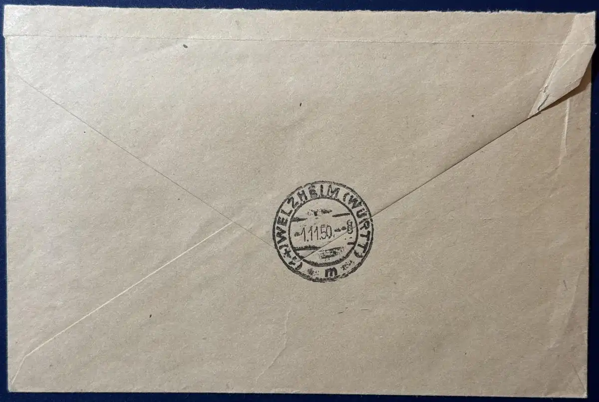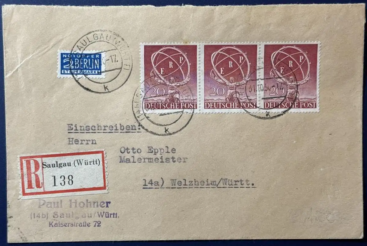 Bedarfsbrief Einschreiben, Mehrfachfrankatur, bestehend aus 3 x Berlin, Mi.Nr. 71 (waagerechter Streifen) und Notopfer, gelaufen mit Poststempel vom 31.10.1950 von Saulgau nach Welzheim (Ankunftsstempel 01.11.1950), gute Erhaltung, saubere Stempel.