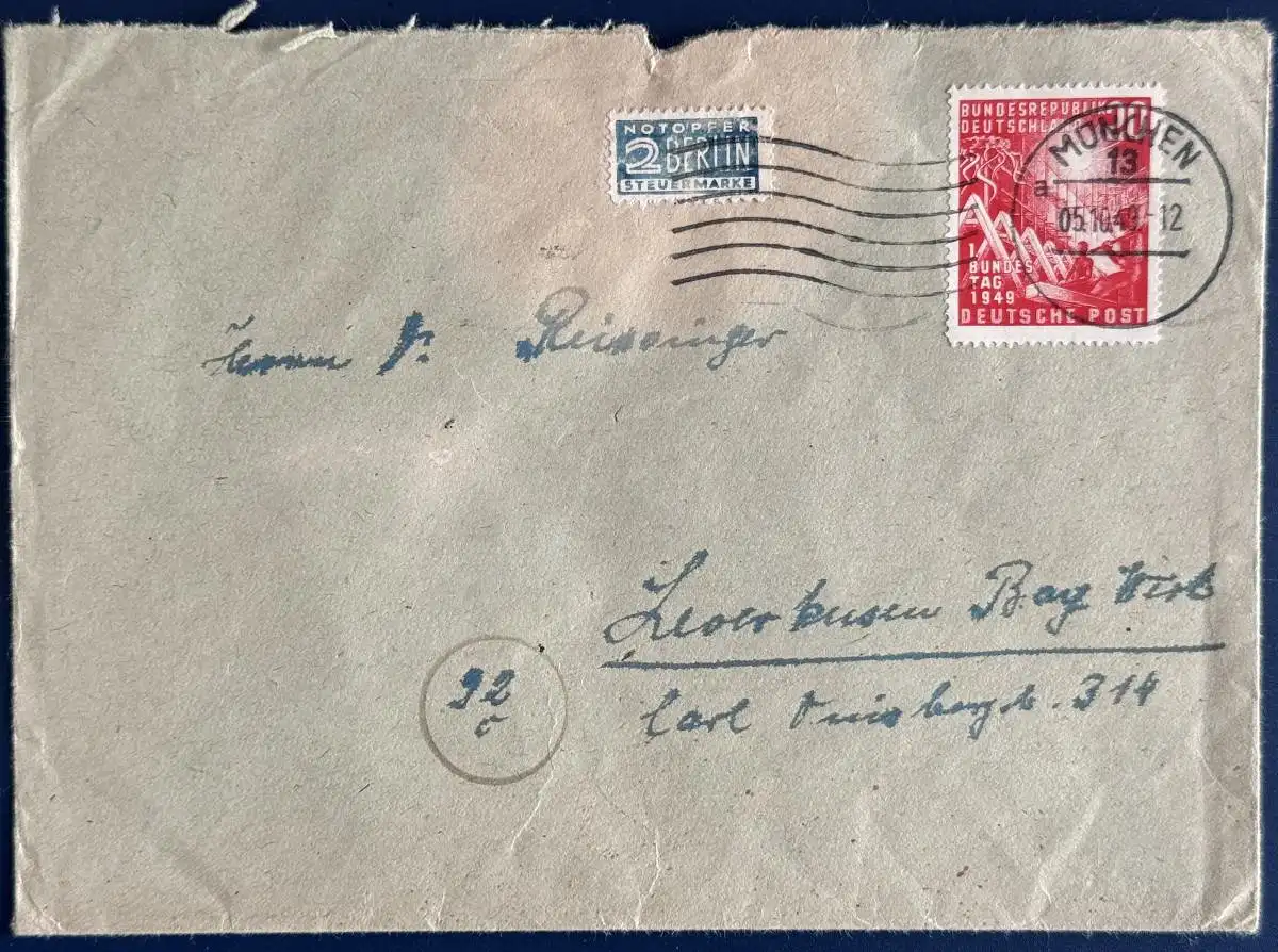 Bedarfsbrief, Bund, frankiert mit Mi.Nr.112 und Notopfer, gelaufen mit Poststempel vom 05.10.1949 von München nach Leverkusen, etwas unsauber geöffnet, klarer Poststempel.
