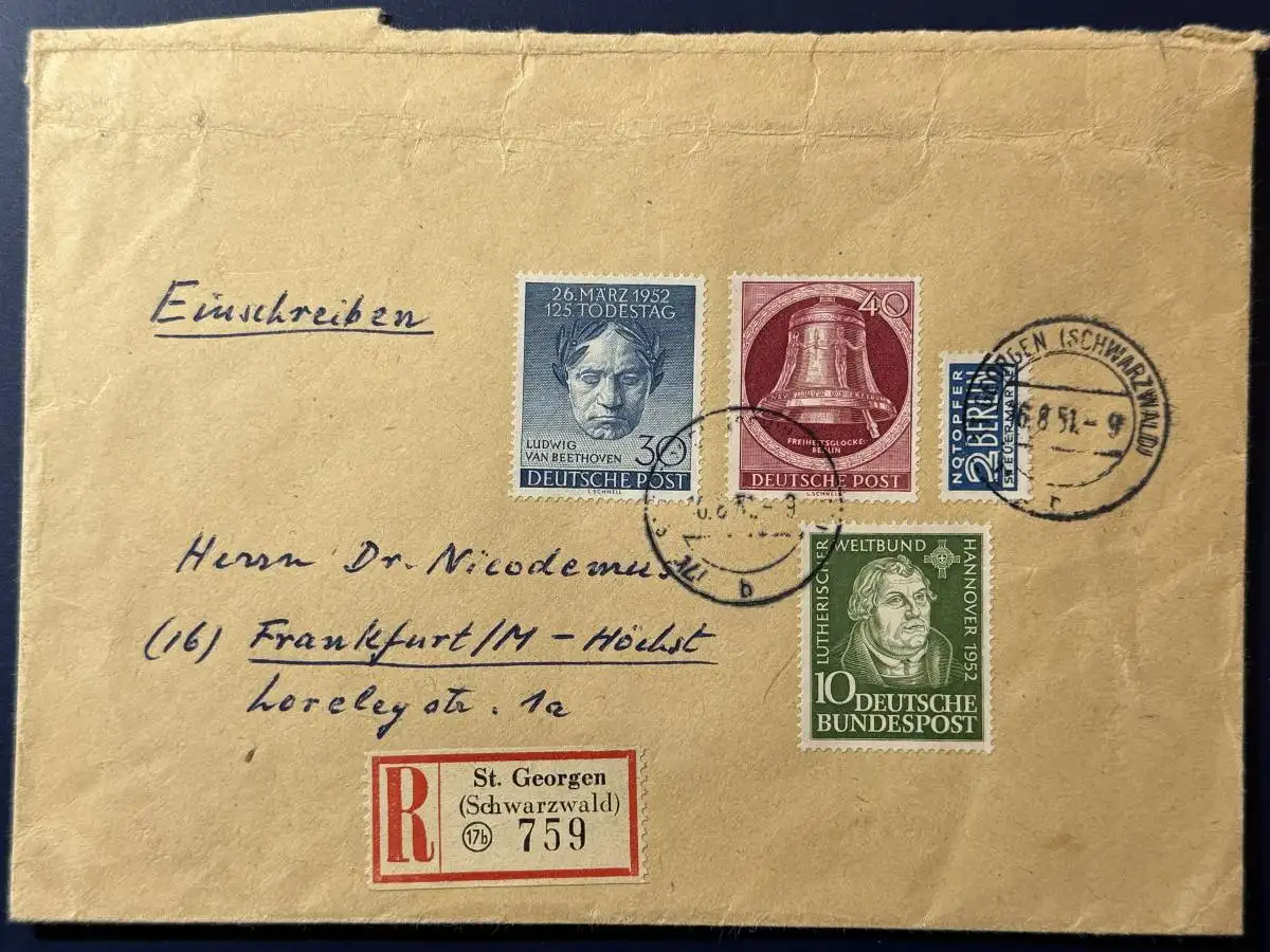Bedarfsbrief, Bund, Einschreiben, Mischfrankatur, bestehend aus Berlin Mi.Nr. 86,87 und Bund Mi.Nr. 149 sowie Notopfer, gelaufen mit Poststempel vom 16.08.2952 von St.Georgen im Schwarzwald nach Frankfurt/Main. Brief wurde unsauber geöffnet, ansonsten sehr gute Erhaltung.