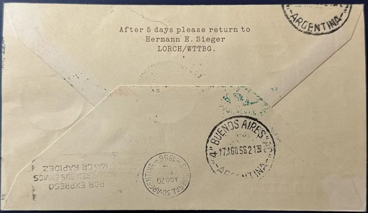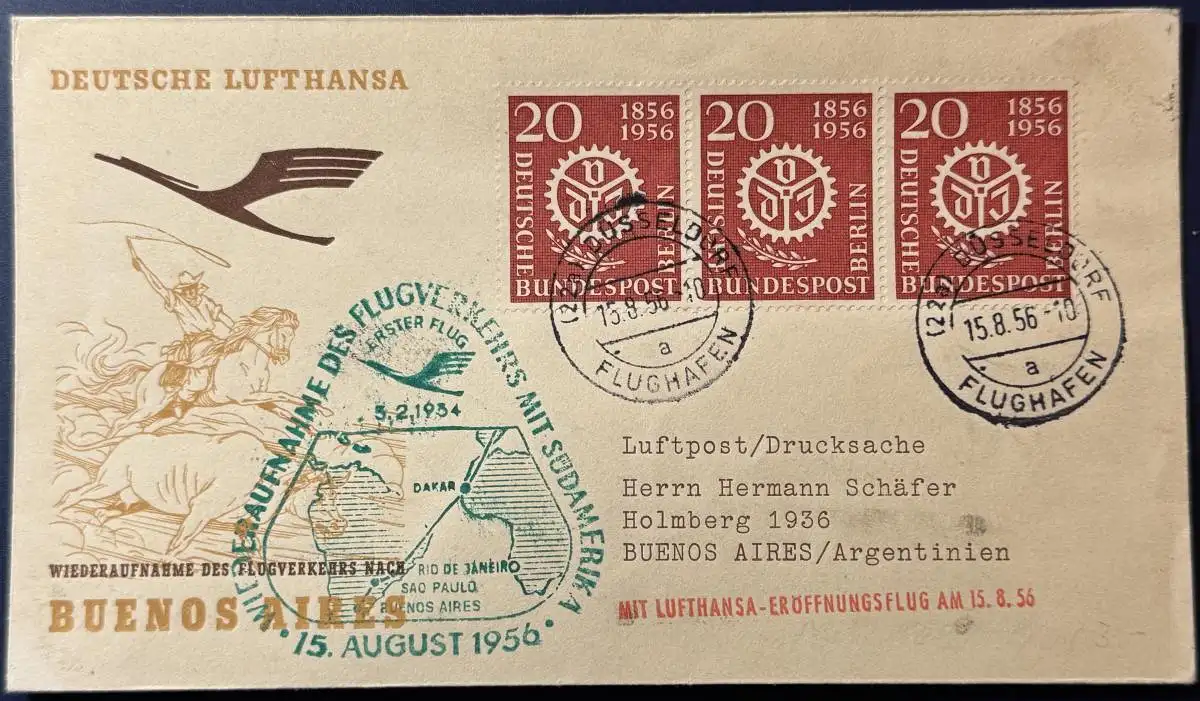 Brief, Lufthansa Eröffnungsflug nach Buenos Aires, Mehrfachfrankatur, bestehend aus 3x Berlin Mi.Nr. 139 (waagerechter Streifen), gelaufen mit Poststempel vom 15.08.1956 von Düsseldorf nach Buenos Aires. Brief ist ausgezeichnet erhalten, saubere Stempel.