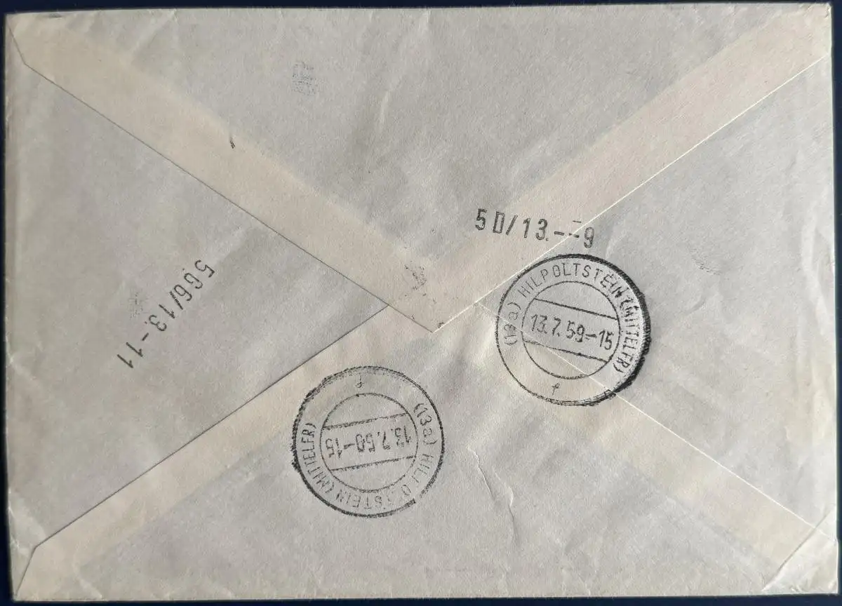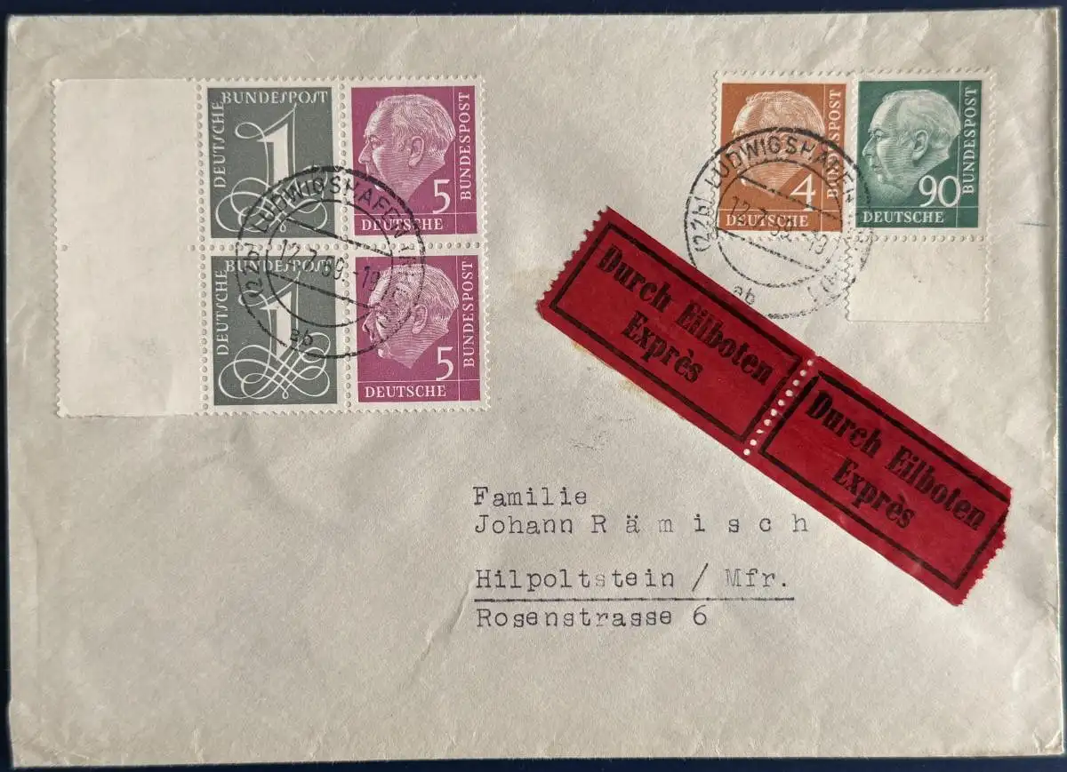 Bedarfsbrief, Bund, Eilboten, Mischfrankatur, bestehend aus Mi.Nr. (2x) W17Y (Zusammendruck aus H-Blatt 8) sowie Mi.Nr. 178 und 193 (mit Unterrand), gelaufen mit Poststempel vom 12.07.1959 von Ludwigshafen nach Hilpoltstein.