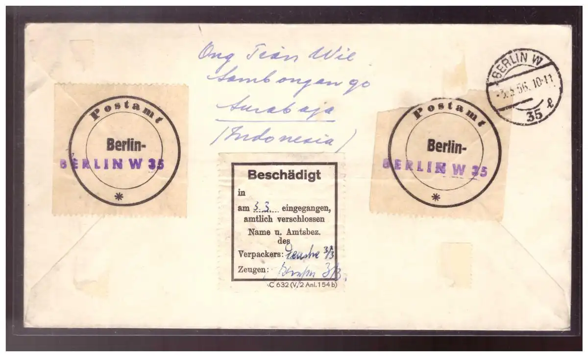 Bund (020118) Einschreiben von Indonesien nach Berlin amtlich wegen Beschädigung verschlossen am 3.3.1956