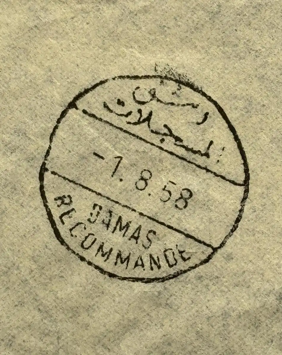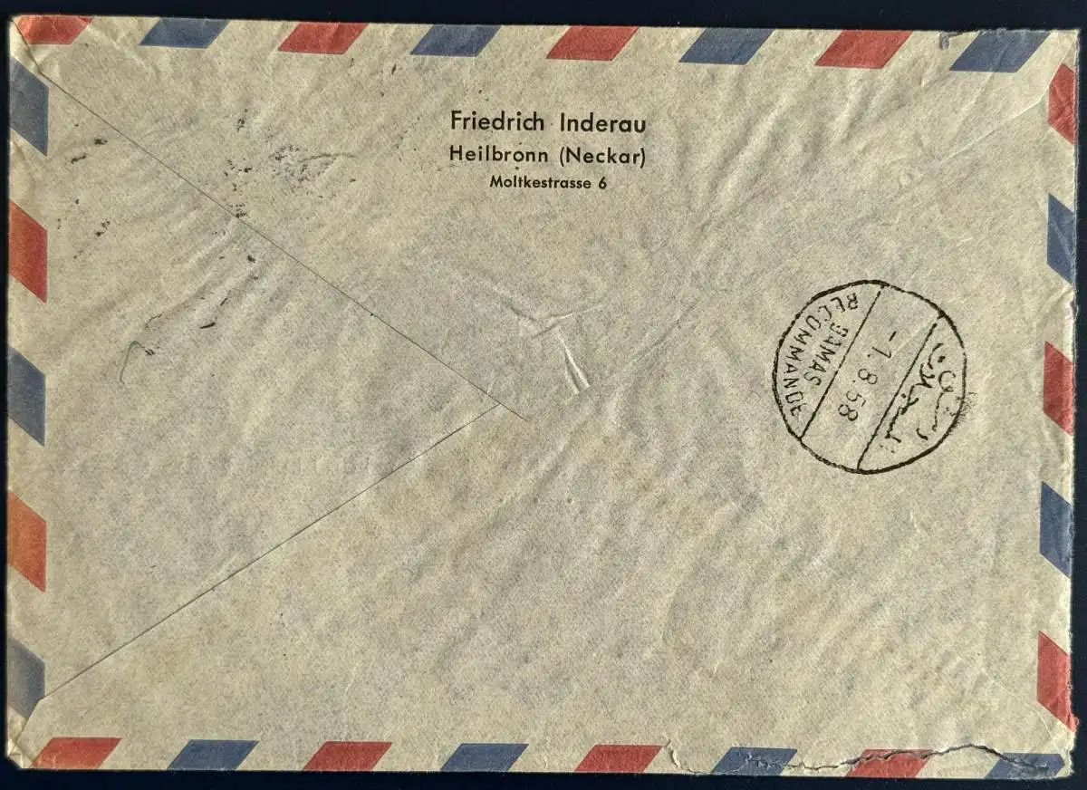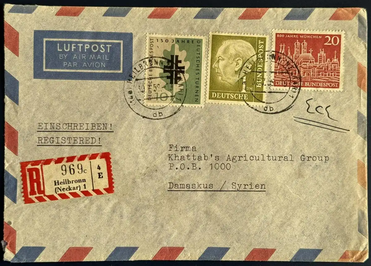Bund, Luftpostbrief, Einschreiben, 1958, Mischfrankatur, bestehend aus Mi.Nr. 194, 289 und 292, gelaufen mit Poststempel vom 30.07.1958 von Heilbronn nach Damaskus/Syrien (Ankunftstempel 01.08.1958). Leichte Vergilbung am rechten Seitenrand, unsauber geöffnet.