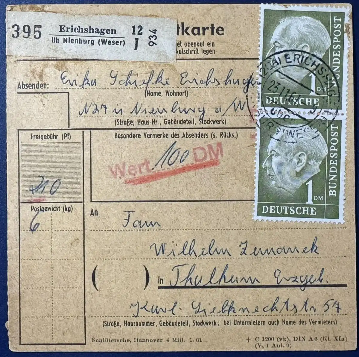 Bund, Paketkarte, 1961, Mehrfachfrankatur, bestehend aus 2x Mi.Nr.194 (senkrechtes Paar) und Mi.Nr.350 (Rückseitig), gelaufen mit Poststempel vom 23.11.1961 von Erichshagen über Nienburg(Weser) nach Thalheim im Erzgebirge, saubere Stempel, gut erhalten.