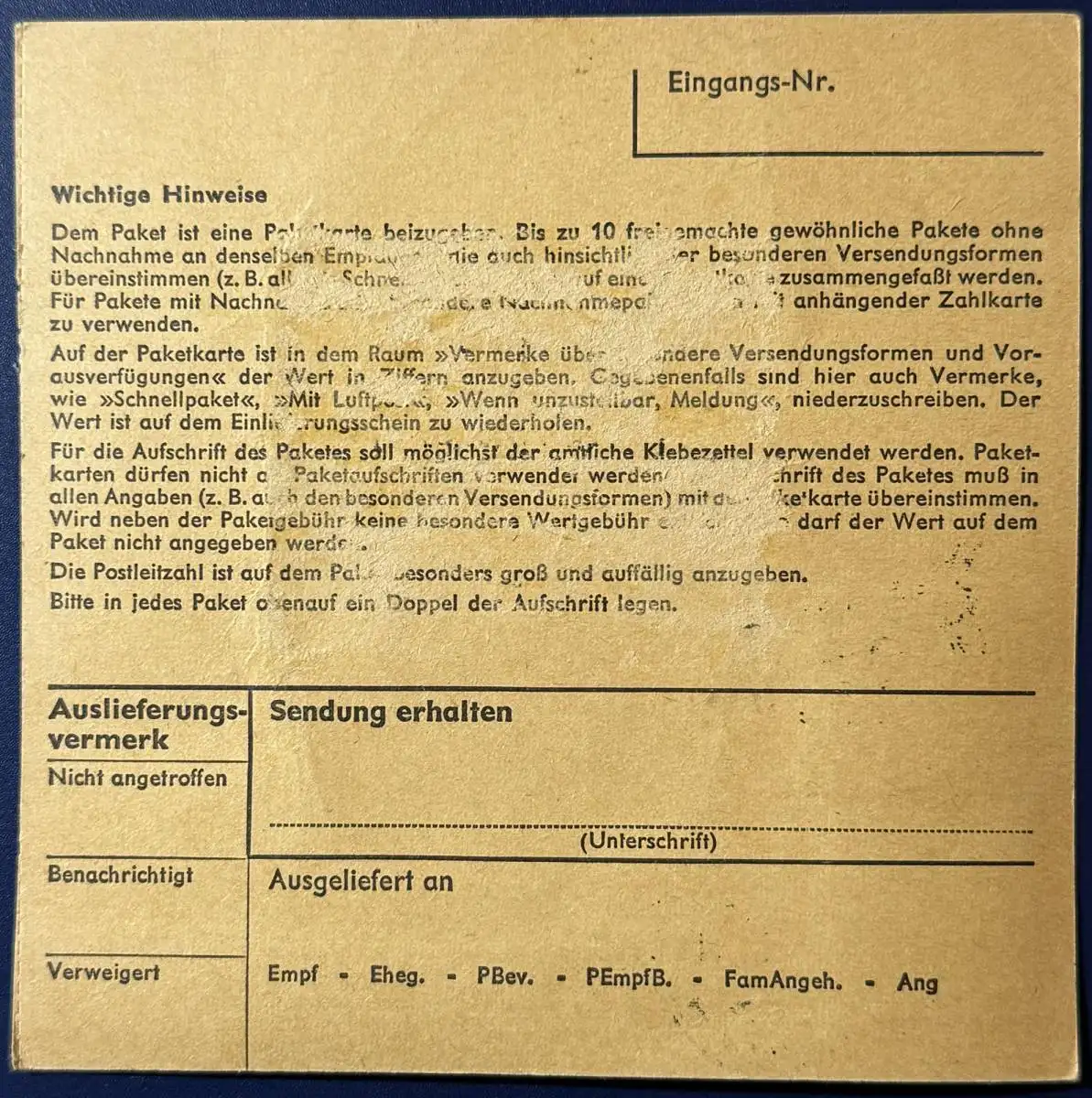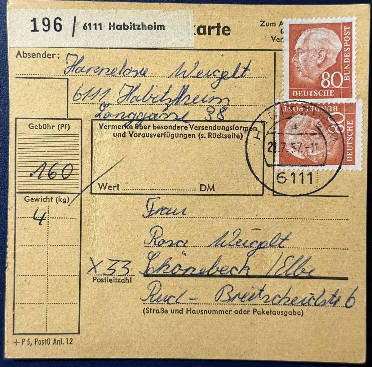 Bund, Paketkarte, 1957, Mehrfachfrankatur, bestehend aus 2x Mi.Nr.264 (Heuss II), gelaufen mit Poststempel vom 28.07.1957 von Habitzheim nach Schönebeck/Elbe, saubere Stempel, auf der Rückseite Abnutzungen (siehe Scan).