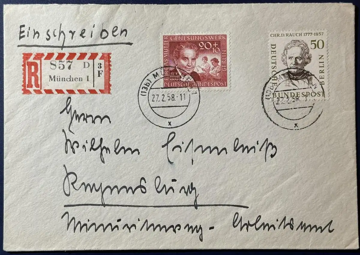 Bund, Einschreiben, 1958, Mischfrankatur, bestehend aus Berlin, Mi.Nr.172 und 178, gelaufen mit Poststempel vom 27.02.1958 von München nach Regensburg. Brief ist sehr gut erhalten, saubere Stempel.