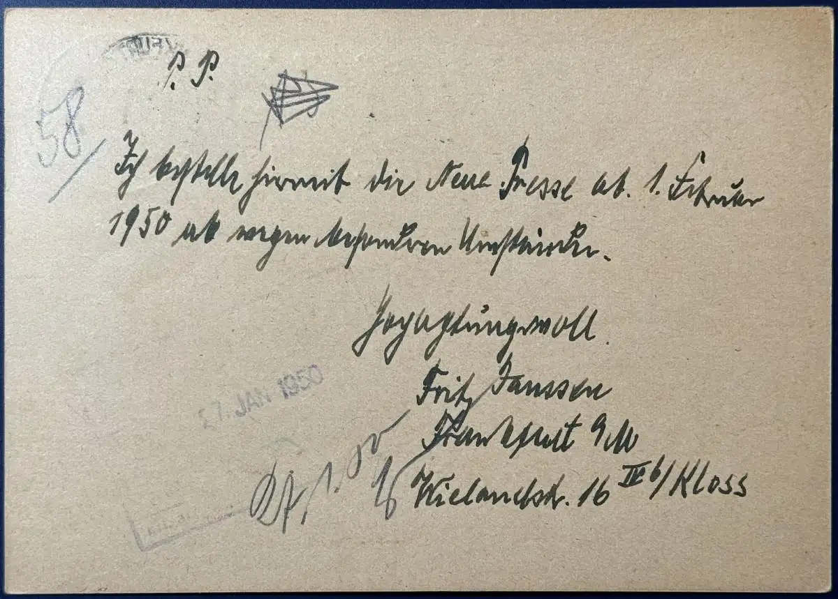 Bund, Postkarte, Ganzsache, 1950, Sonderpostkarte, Mi.Nr. PSo1, gelaufen mit Poststempel vom 27.01.1950 in Frankfurt, Karte ist sehr gut erhalten.
