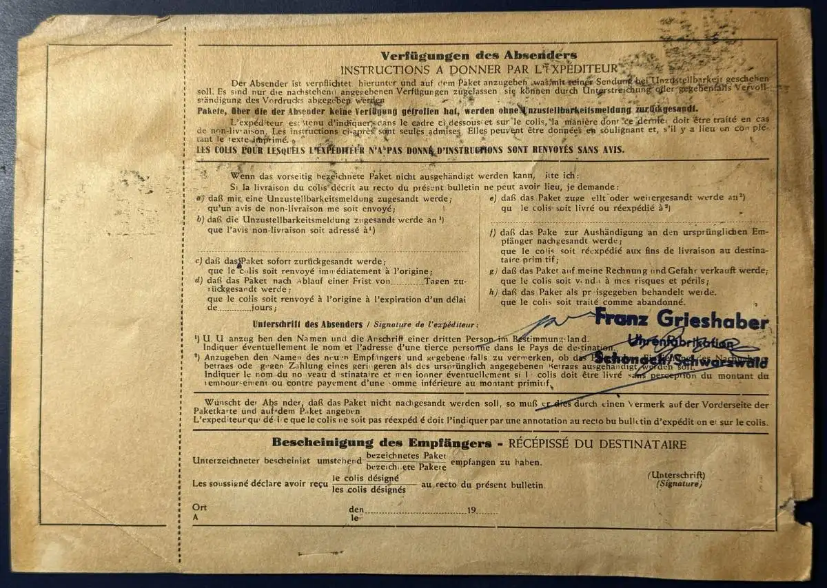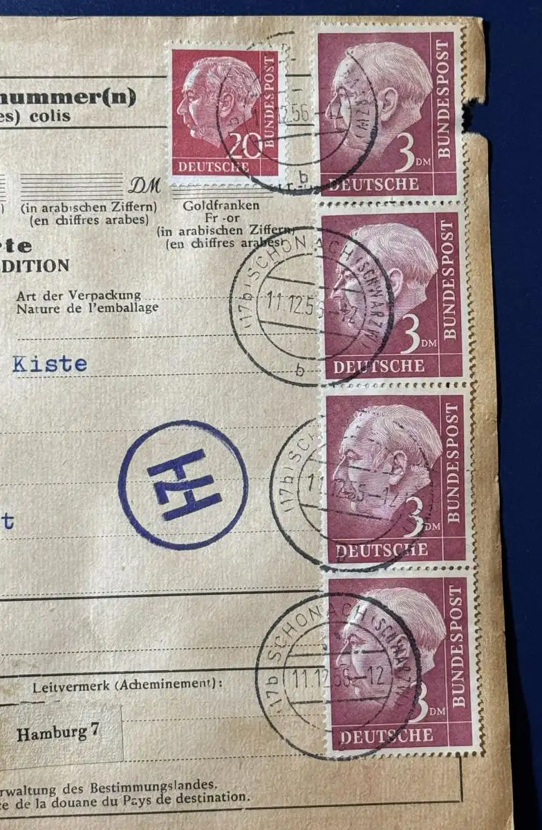 Auslandspaketkarte, Bund, 1956, Mischfrankatur, bestehend aus 4x Mi.Nr. 196 und 1x Mi.Nr. 185, gelaufen mit Poststempel vom 11.12.56 von Schonach nach Vallejo, Californien. Paketkarte hat Gebrauchsspuren (siehe Scan), Leitzettel Hamburg 7, saubere Stempel. Versand erfolgt mit Sendungsnachweis.