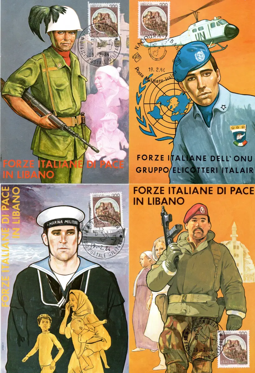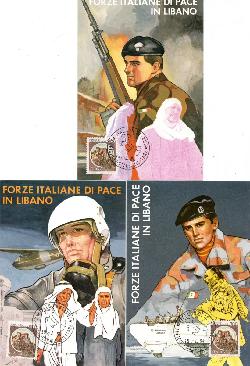 C - Schlösser in Friedensmission - Lot von sieben verschiedenen frankierten Postkarten mit 200-Lire-Briefmarke (Nr. 1516) gestempelt mit Sonderstempel Militärpostamt für Interforce-Missionen in Beirut und Libanon - Nett zusammen, um die Sammlung zu spezialisieren Cod.447/182