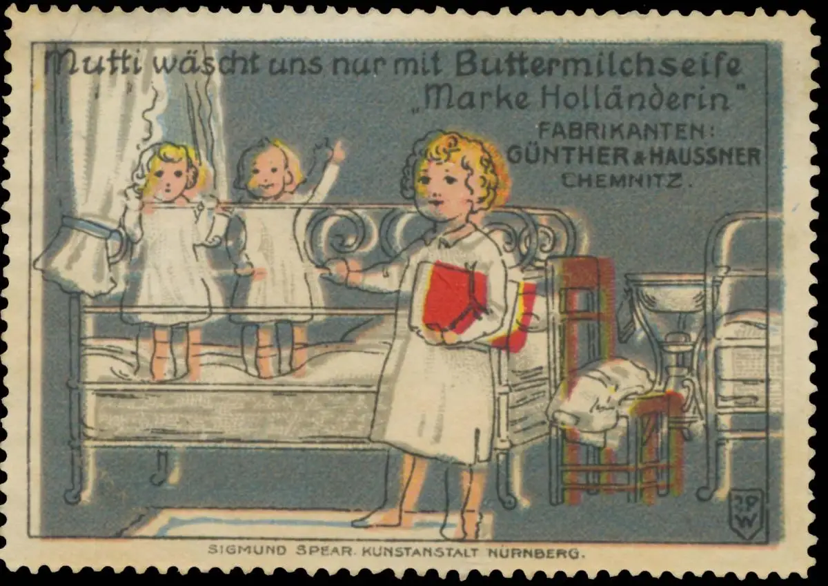 Mutti wäscht uns nur mit Buttermilchseife Marke Holländerin. Fabrikanten: Günther & Haussner, Chemnitz, Kosmetik, Größe/Zustand: 5x7 , Fehldruck, guter Zustand, Original alte Reklamemarke die seinerzeit für die Werbung benutzt wurde