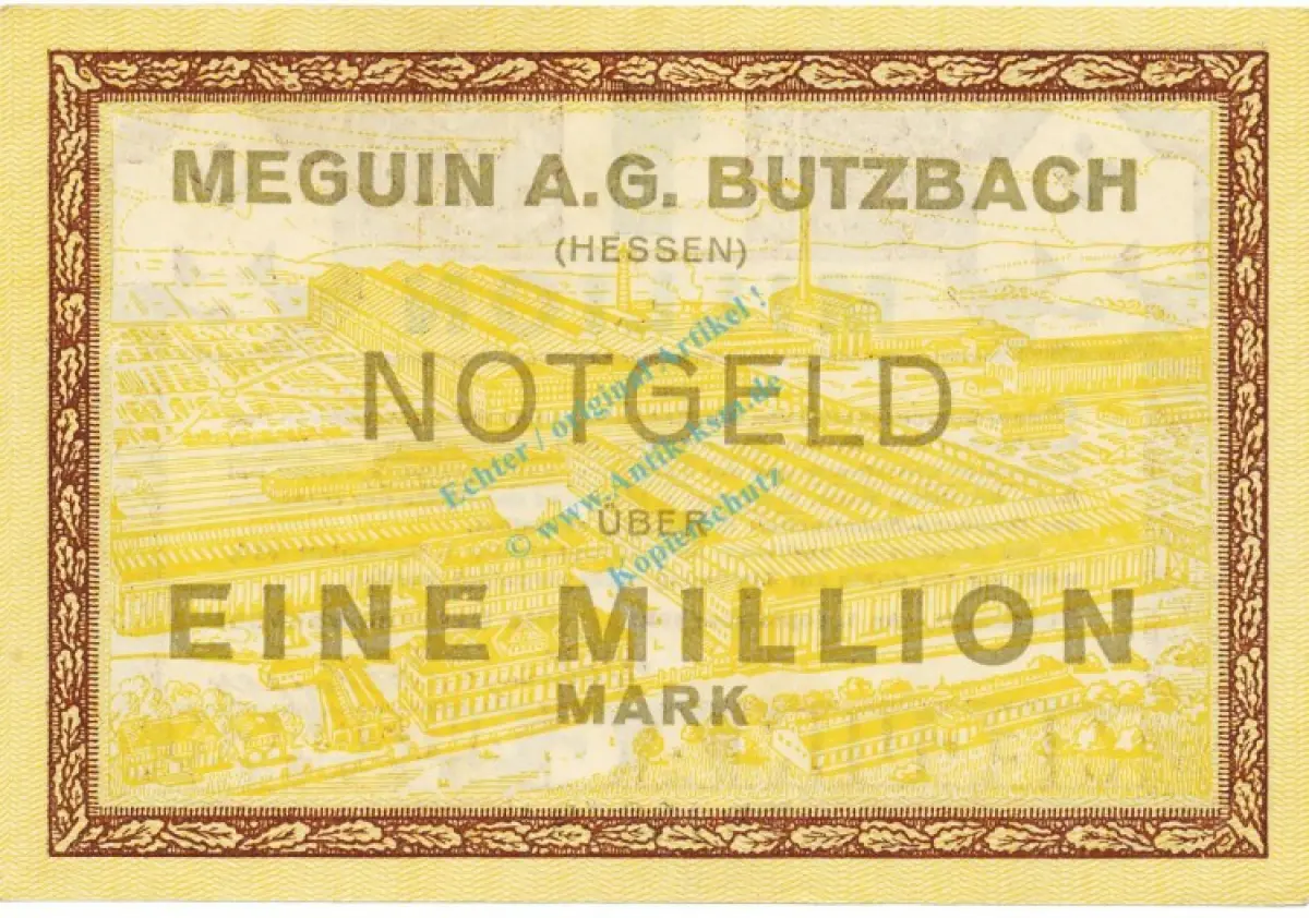 Butzbach , Banknote 1 Million Mark Schein unc-kfr. Keller 702.b , Hessen 1923 InflationNotgeld - Gutschein : Meguin AG Butzbach , 01.09.1923
