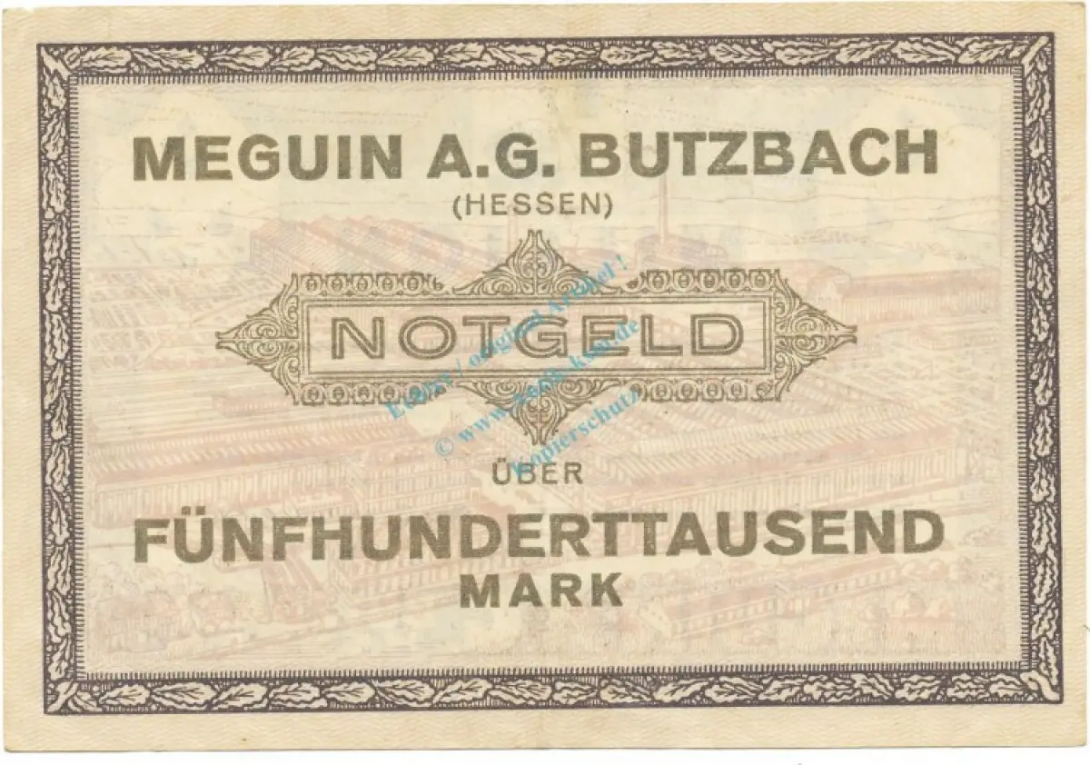 Butzbach , Banknote 1 halbe Million Mark Schein L-gbr. Keller 702.b , Hessen 1923 InflationNotgeld - Gutschein : Meguin AG Butzbach , 01.09.1923