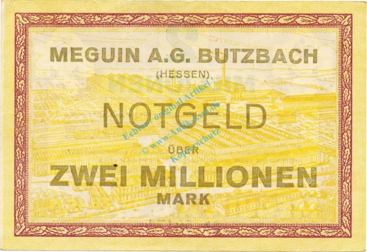 Butzbach , Banknote 2 Millionen Mark Schein unc-kfr. Keller 702.b , Hessen 1923 InflationNotgeld - Gutschein : Meguin AG Butzbach , 01.09.1923