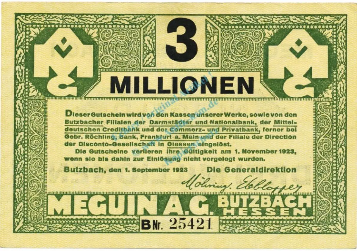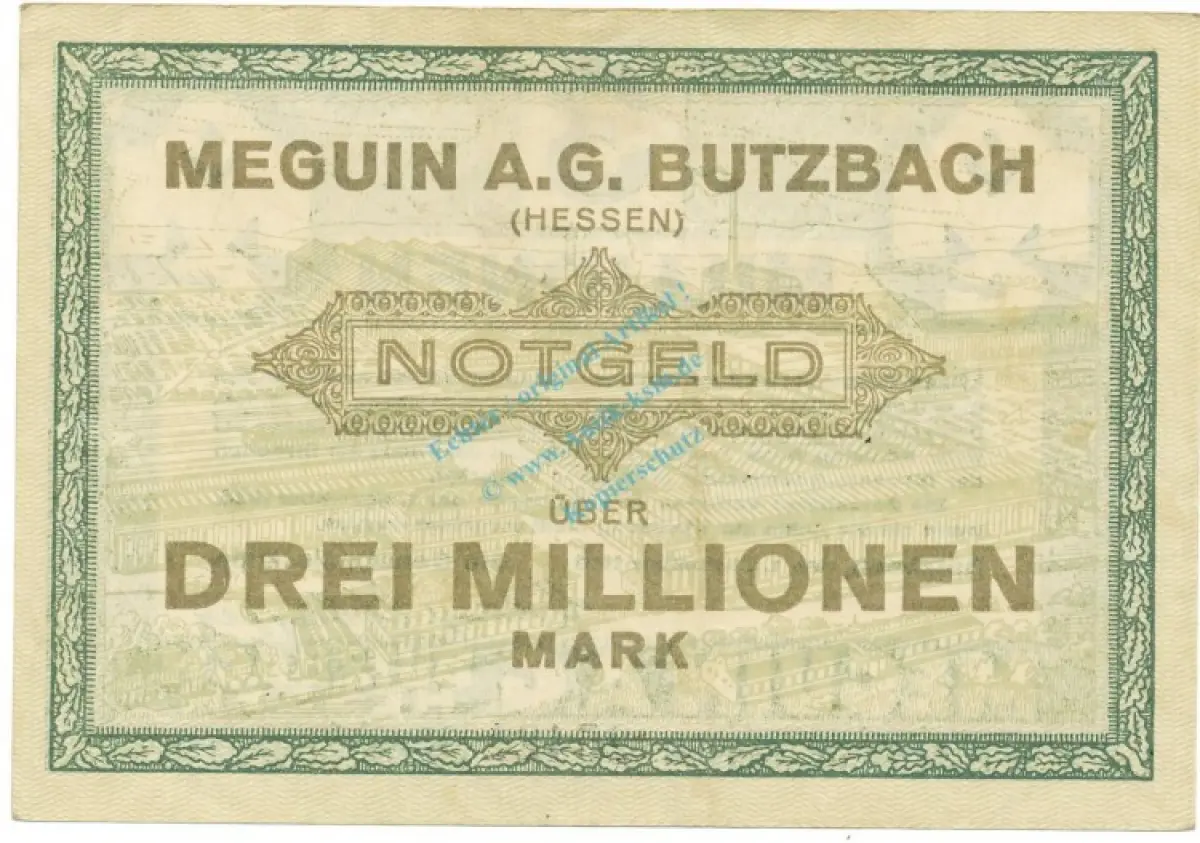 Butzbach , Banknote 3 Millionen Mark Schein L-gbr. Keller 702.b , Hessen 1923 InflationNotgeld - Gutschein : Meguin AG Butzbach , 01.09.1923