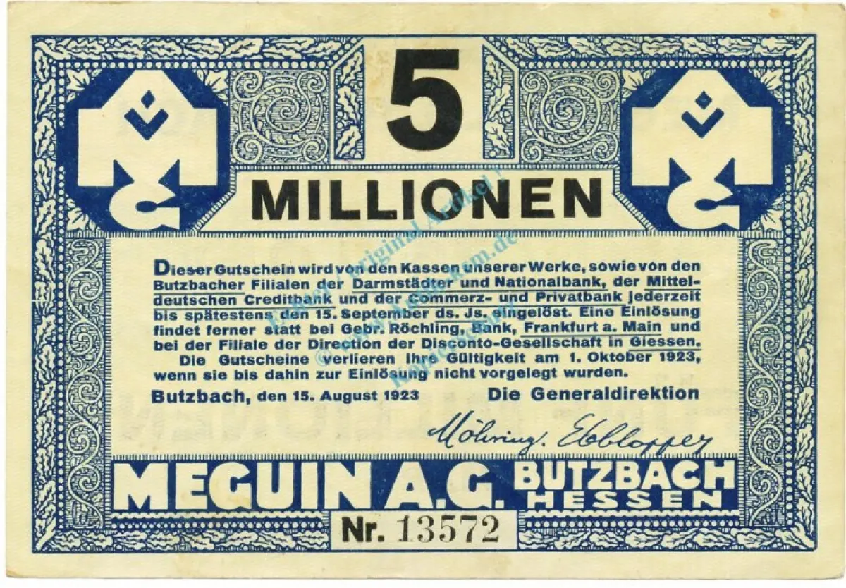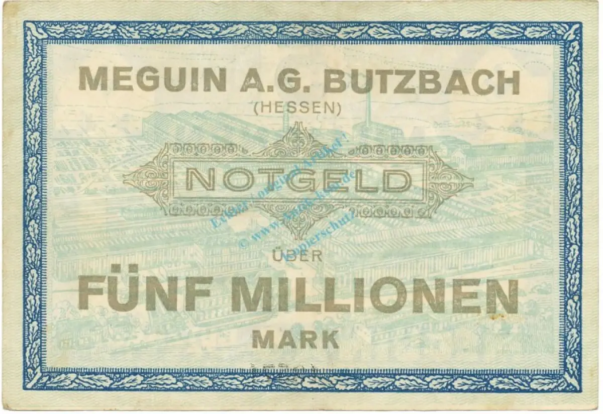 Butzbach , Banknote 5 Millionen Mark Schein L-gbr. Keller 702.a , Hessen 1923 InflationNotgeld - Gutschein : Meguin AG Butzbach , 15.08.1923