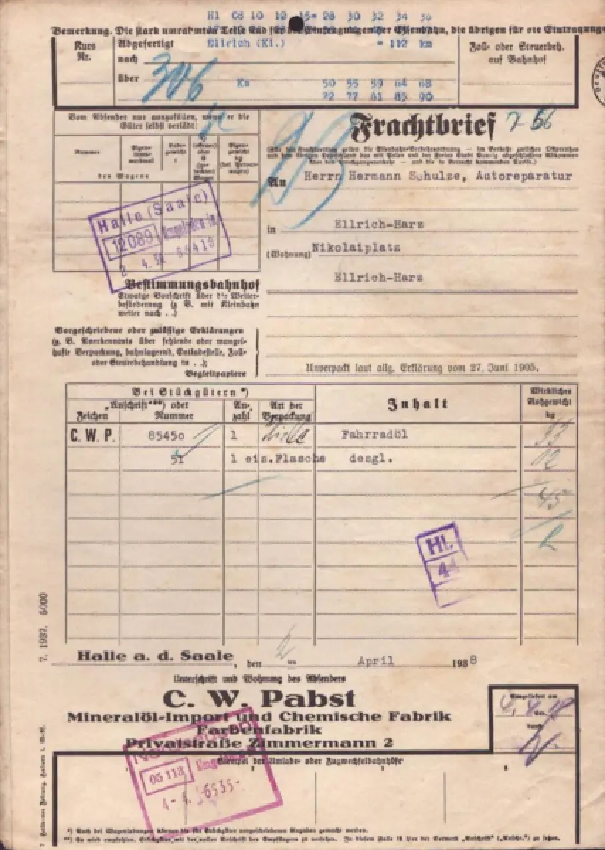 C. W. Pabst Halle / Saale Frachtbrief 1938
