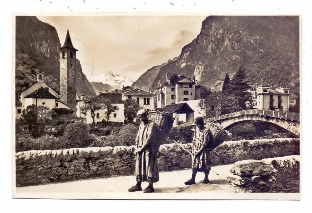 CH 6676 BIGNASCO TI, Panorama, Kinder mit Tragekörben, 1938, rücks. Klebereste