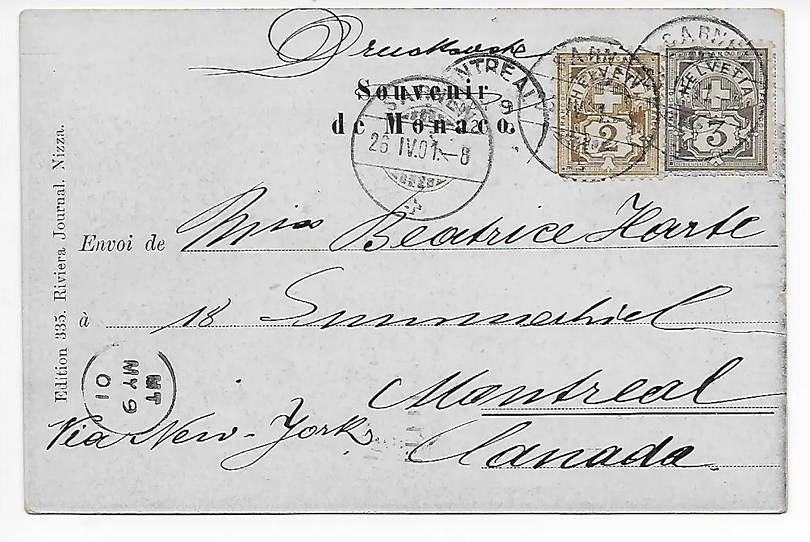 CH: AK Nizza aus der Schweiz über New York nach Montreal, 1901