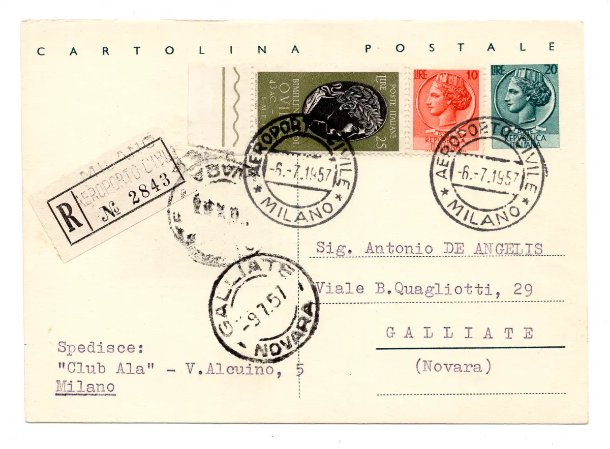- C.P. Lire 20 Syrakus - Privatausgabe MAB 57 Luftveranstaltung Barack vom 6.7.57 (Aufdruck auf der Rückseite) gereist Racc. von Aeroporto Civile Milano nach Galliate - Seltene Nr. 1078/18