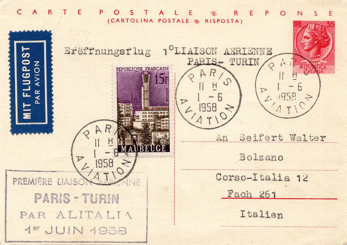 C - C.P. Lire 35 + 35 Syrakus Nr. C 157 - die Antwortkarte gereist per Flugzeug mit Alitalia Flug von Paris nach Turin am 1.6.58 mit französischer Zusatzmarke - perfekt, selten Cod.1141/182