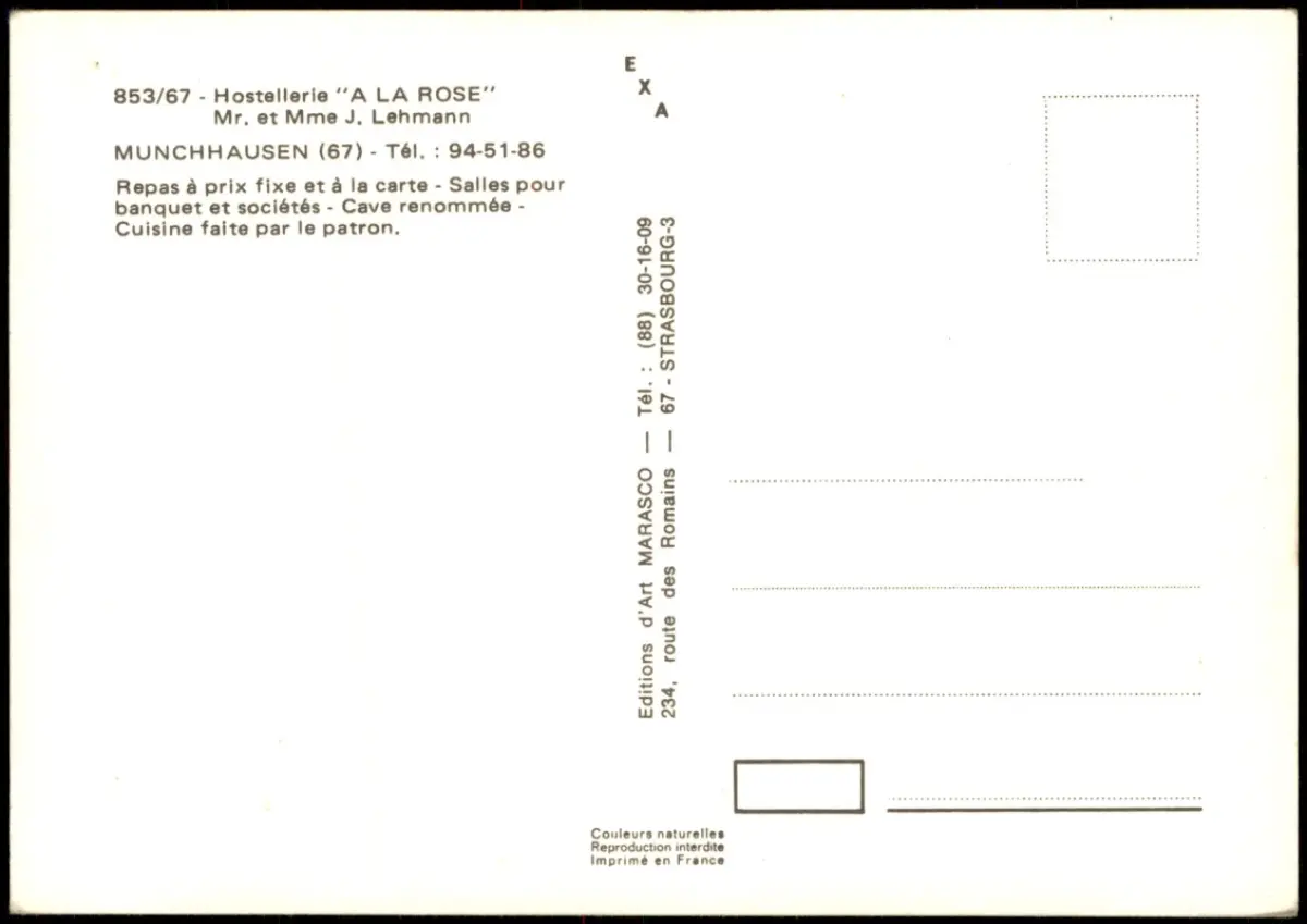 Infos: Ansichtskarte der Hostellerie 'A LA ROSE' in Munchhausen (Bas-Rhin, Elsass). Die Abbildung zeigt das markante Fachwerkgebäude des Gasthofs sowie ein benachbartes Gebäude. Laut Text wurde das Haus von Mr. et Mme J. Lehmann geführt und bot Säle für Bankette sowie eine renommierte Küche an. Die Karte wurde in Frankreich gedruckt.