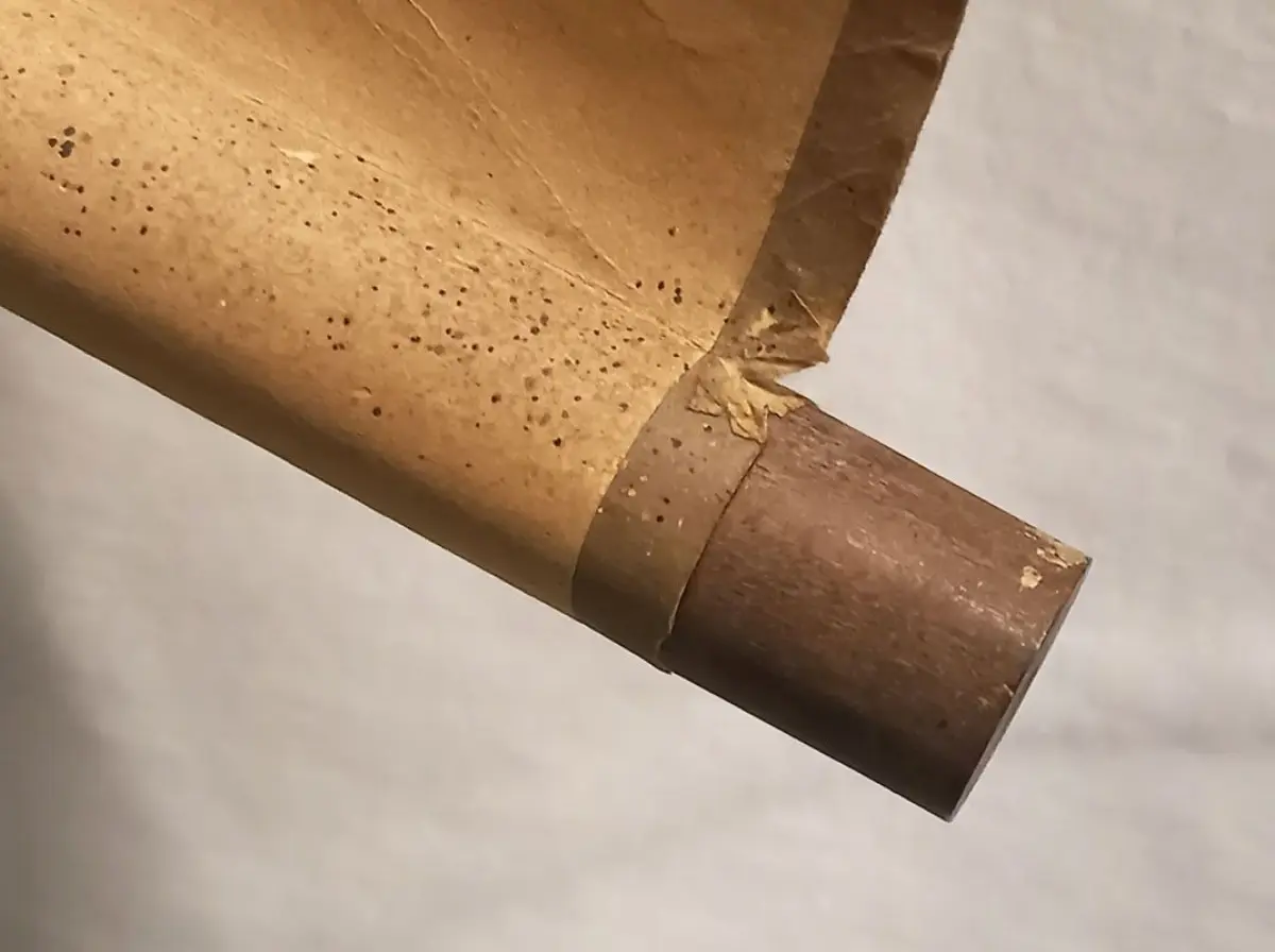 Japan. Antique hanging paper scroll. Bordered with different paper. Heigth 72,4". Width 17,7" (ca. 184 x45 cm). Wodden roller ends. Few minor damages on the edges and roller ends.