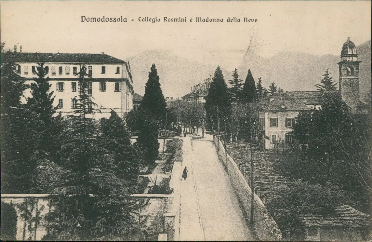 Infos: Ansicht der Stadt Domodossola mit dem Collegio Rosmini auf der linken Seite und der Kirche Madonna della Neve mit ihrem markanten Glockenturm auf der rechten Seite. Eine Straße führt durch die Szene, umgeben von Bäumen und weiteren Gebäuden, mit Bergen im Hintergrund. Eine einzelne Person ist auf der Straße zu sehen.