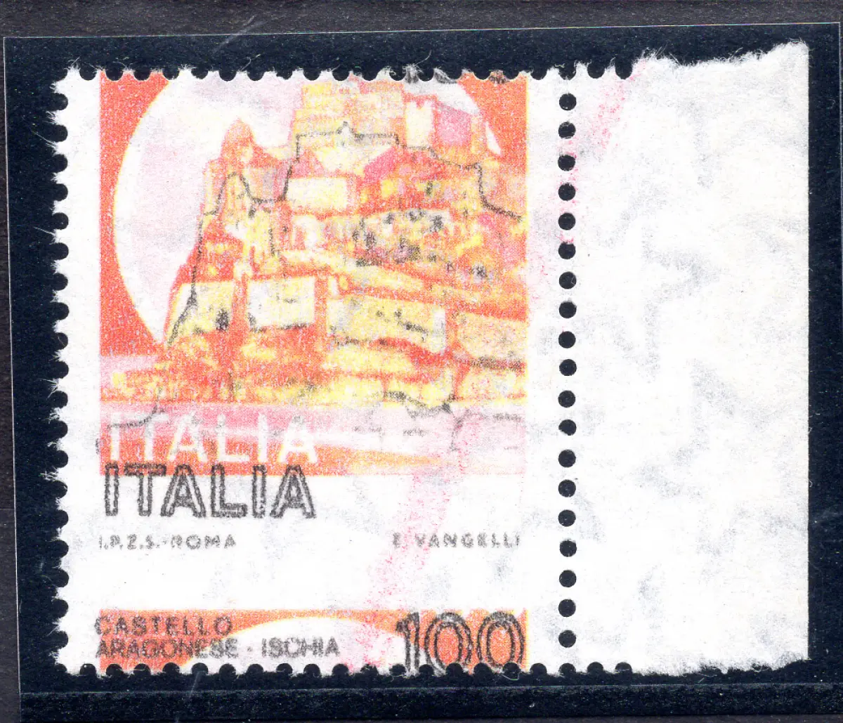 Castelli Lire 100 Sorte verschobene Verzahnung, ohne Blaudruck Vollgummi - Castelli Lire 100 Nr. 1511 stark vertikal verschobene Verzahnung, ohne Blaudruck, mit stark nach unten verschobenem Schwarzdruck - Uncommon Code 540/7
