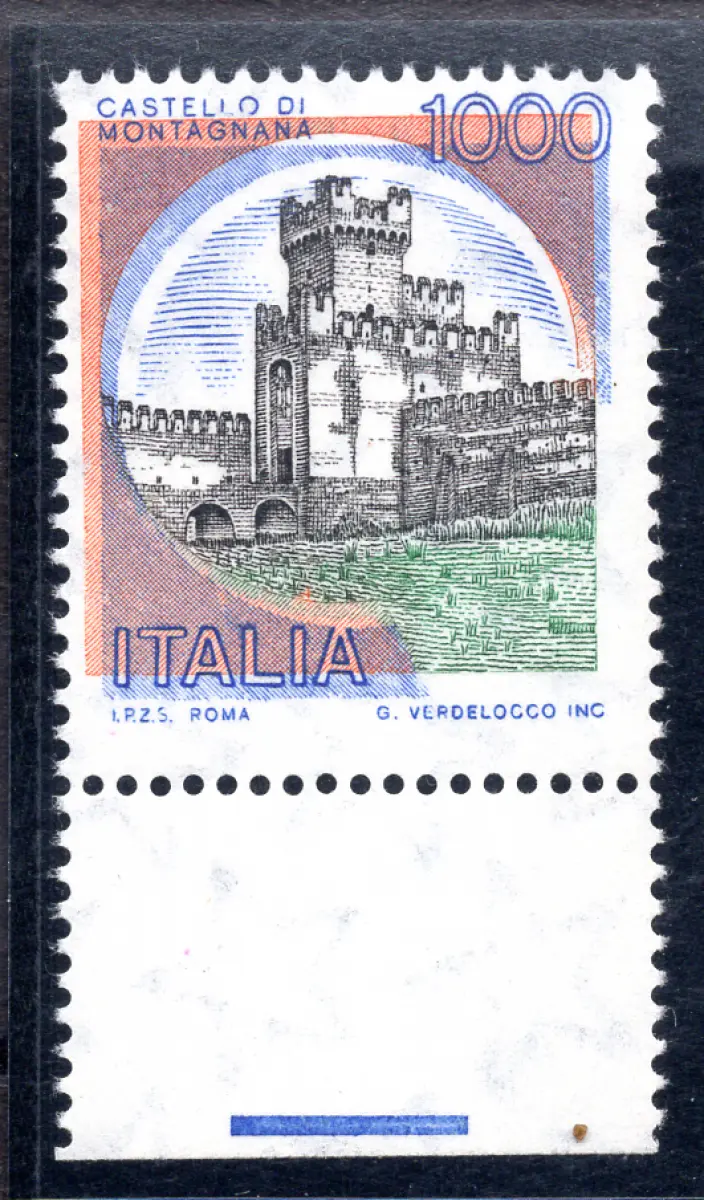 Castelli Lire 1.000 Sorten verschobener Boden Vollgummi - Castelli Lire 1.000 schönes Exemplar Blattecke mit verschobenem Bodendruck Nr. 182/WEB