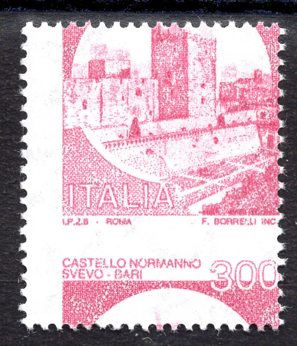 Castelli Lire 300 Nr. 1518/II zweite Auflage Sorte Verzahnung Vollgummi - MHN - - Castelli Lire 300 Nr. 1518/II zweite Auflage Tiefdruck - schönes Exemplar mit stark in beide Richtungen verschobener Verzahnung, ohne Druck der Mittelfarben (blau, rot und gelb) Cod. 713/14