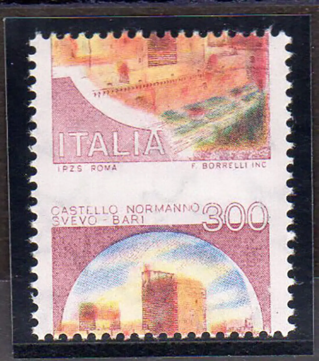 Castelli Lire 300 Sorte verschobene horizontale Verzahnung Vollgummi MNH - Castelli Lire 300 Nr. 1518 stark vertikal verschobene horizontale Verzahnung - Schlossname und Wert in der Mitte - Schön und ungewöhnlich Cod. 609/15