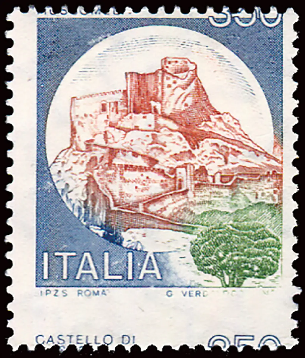Castelli Lire 350 Sorte verschobene Verzahnung Vollgummi MNH - Castelli Lire 350 Nr. 1519 stark verschobene horizontale Verzahnung - das Wort Schloss ist unten - Cod. 615/15