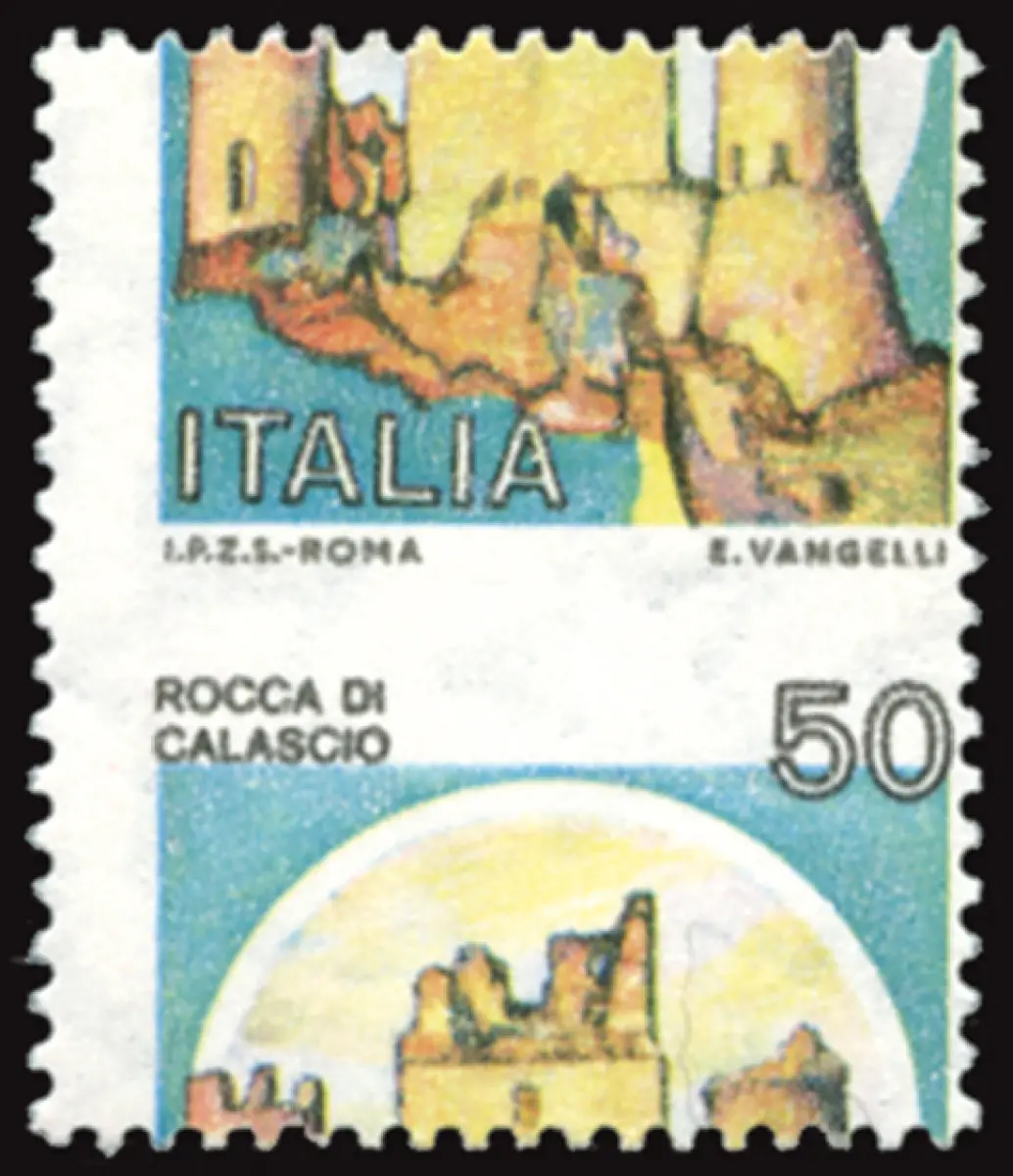 Castelli Lire 50 Sorten Wert in der Mitte Vollgummi MNH - Castelli Lire 50 Nr. 1508 horizontale Verzahnung stark verschoben, so dass Schriftzüge und Wert in der Mitte der Briefmarke sind - Ungewöhnlich Cod. 563/16