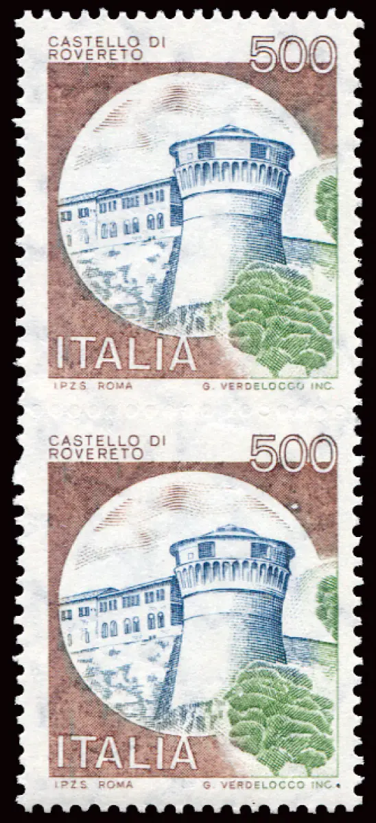 Castelli Lire 500 Sorte vertikales Paar ungezahnt in der Mitte Vollgummi MNH - Castelli Lire 500 Nr. 1522 vertikales Paar ungezahnt in der Mitte (Blindzahnung) - Ungewöhnlich Cod. 628/15