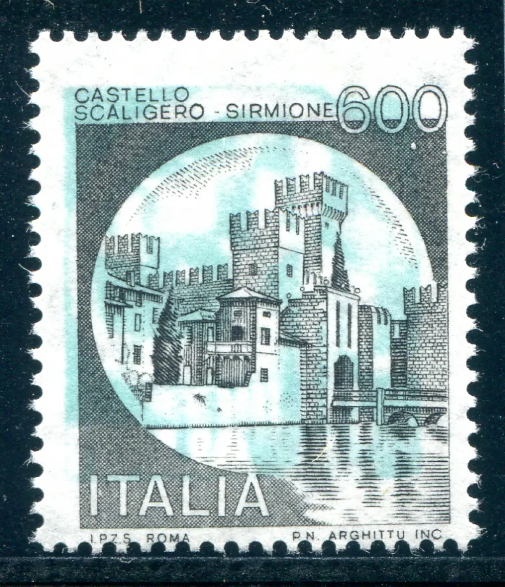 Castelli Lire 600 verschobene grüne Sorte Vollgummi MNH - Castelli Lire 600 Nr. 1523 stark über 3 mm nach oben verschobener grüner Hintergrunddruck. Cod. 635/16