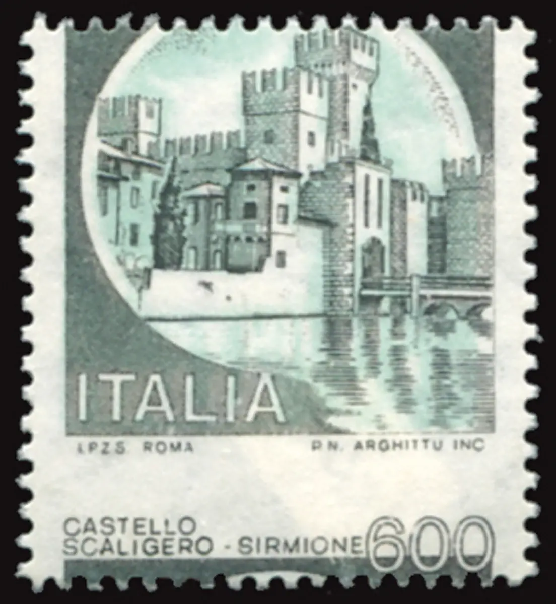 Castelli Lire 600 Sorten Wert unten Vollgummi MNH - Castelli Lire 600 Nr. 1523 stark verschobene horizontale Verzahnung Castello Scaligero 600 unten statt oben Cod. 634/16