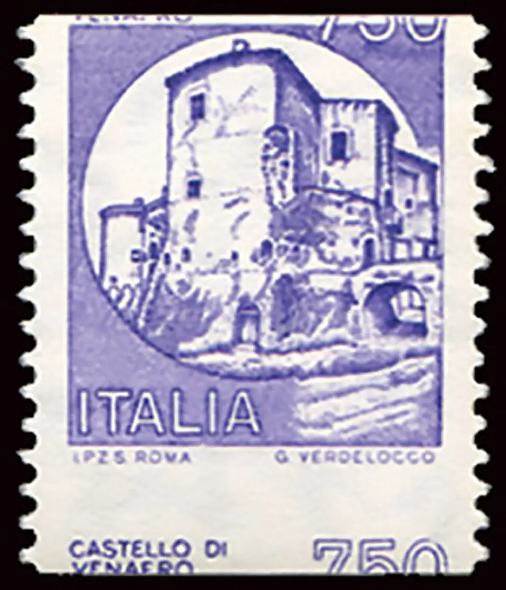 Castelli Lire 750 Maschinen Sortenschliff verschoben Vollgummi - MHN - - Castelli Lire 750 Nr. 1530G Emission für Verteilerautomaten mit stark verschobenem horizontalem Schnitt, so dass der Name des Schlosses und der Wert 750 unten statt oben liegen - Ungewöhnlich Cod. 744/14