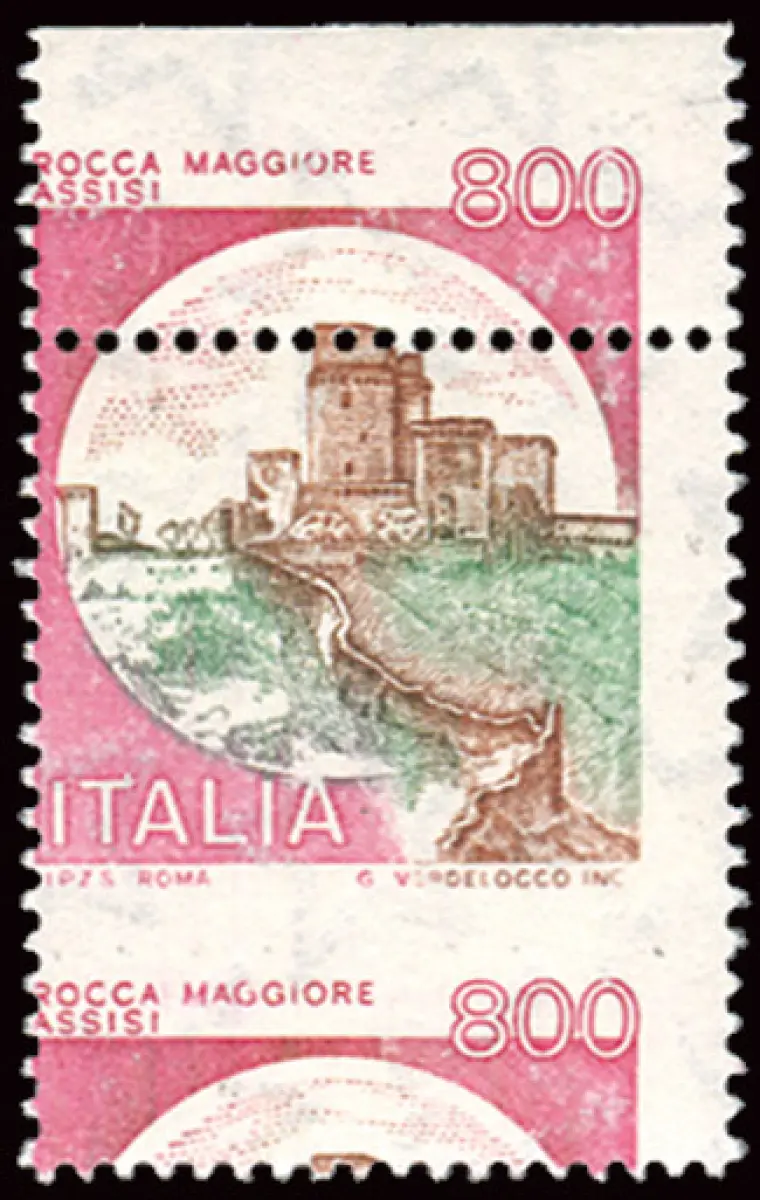 Castelli Lire 800 Sorte verschobene Verzahnung Vollgummi - MHN - - Castelli Lire 800 Nr. 1525 schönes Exemplar b. von f. oben mit stark verschobener horizontaler Verzahnung, so dass der Name des Schlosses und die Ziffer unten statt oben sind, am Blattrand wiederholt - Ungewöhnlich bei diesen Merkmalen Cod. 730/14