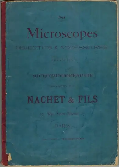 Catalogue Descriptif des Instruments de Micrographie construits par Nachet & Fils Fournisseurs. [Umschlagtitel abweichend: Microscopes. Objectifs & Accenssoires. Appareils de Microphotographie] Paris, Nachet & Fils, 1892.