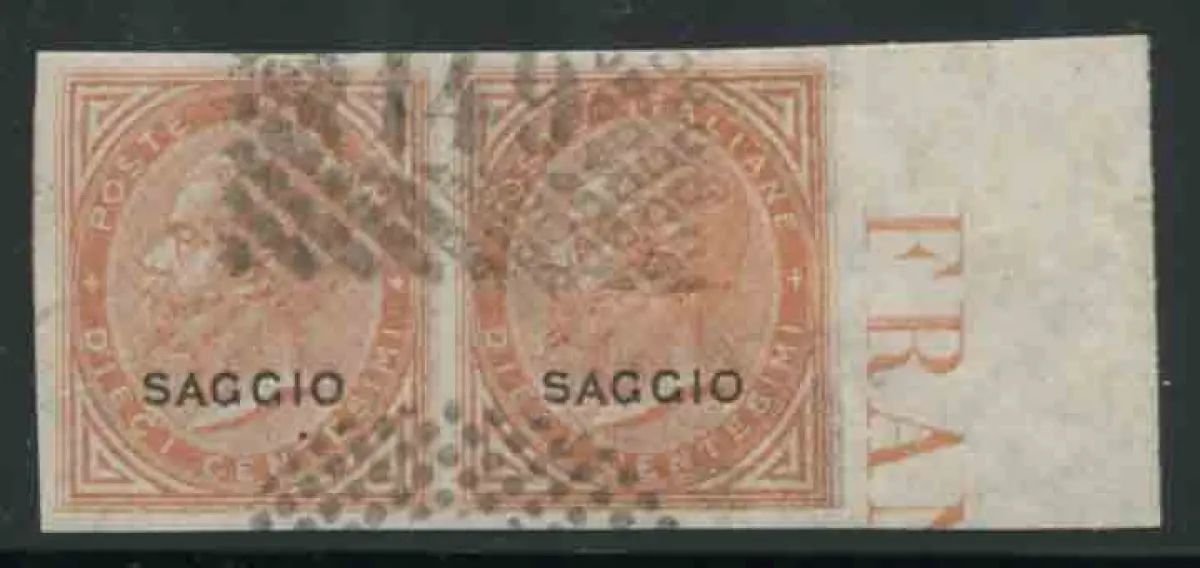 Cent. 10 Stornierungstests 149 auf gebrauchtem Essay Drehmoment - Vitt. Emanuele II. Cent. 10 Nr. 17 Löschprobe 149 in Rauten auf ungezahntem Paar aufgedruckt Essay in schwarz - selten - G. Bolaffi Code Nr. 135/4