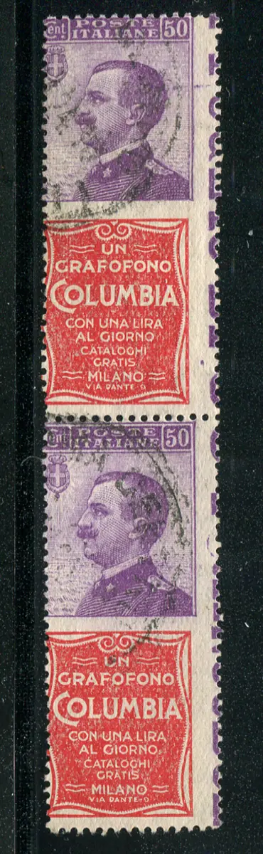 Cent Werbung. 50 Columbia Sorten Zahnung gebraucht - Werbung Cent. 50 Columbia Nr. 11. vertikales Paar mit stark nach rechts verschobener vertikaler Verzahnung und Teil der Randbeschriftungen in der Vignette Cod. 172/13