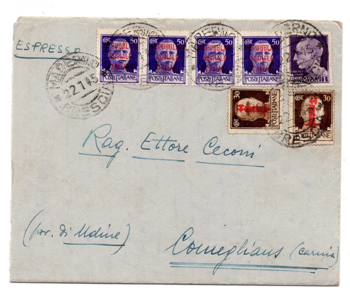 Centschelle. 50 Nr. 493 vier Exemplare + Ergänzungsnr. 252A + 492 x 2 auf Umschlag - Centschelle. 50 Nr. 493 vier Exemplare + Ergänzungsnr. 252A + 492 x 2 auf Espressumschlag von Maderno nach Coneglians am 22.1.45 - eine Cent-Briefmarke. 30 mit Mängeln vermutlich durch Wiederverwendung - Ungewöhnliche Nr. 344/20