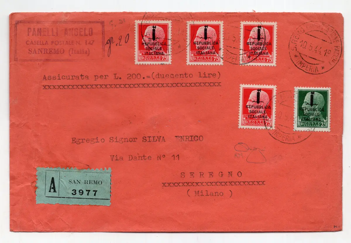 Umschlag - Centband. 75 (Auflage Rom) Nr. 494 vier Exemplare + Ergänzung Nr. 491 auf versichertem Umschlag von Sanremo nach Seregno am 10.5.44 - Seltene Mehrfachfrankatur dieses Wertes - Genauer Tarif für Briefe zwei Häfen (gr. 20) versichert Lire 200 - für Spezialisten - S. Vignati Cod. 2942 / WEB
