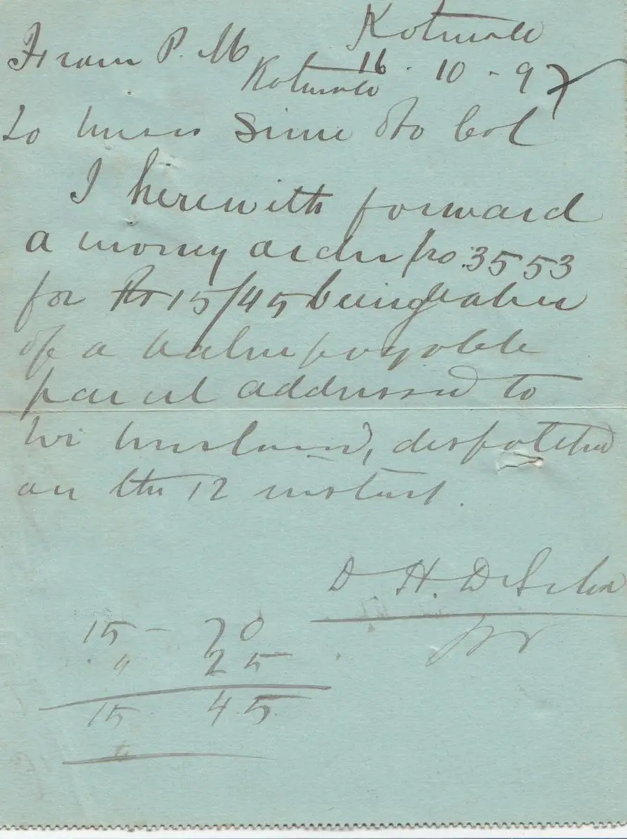 Ceylon: 1899: Letter Card Kotmalxx Moneyorder to Colombo