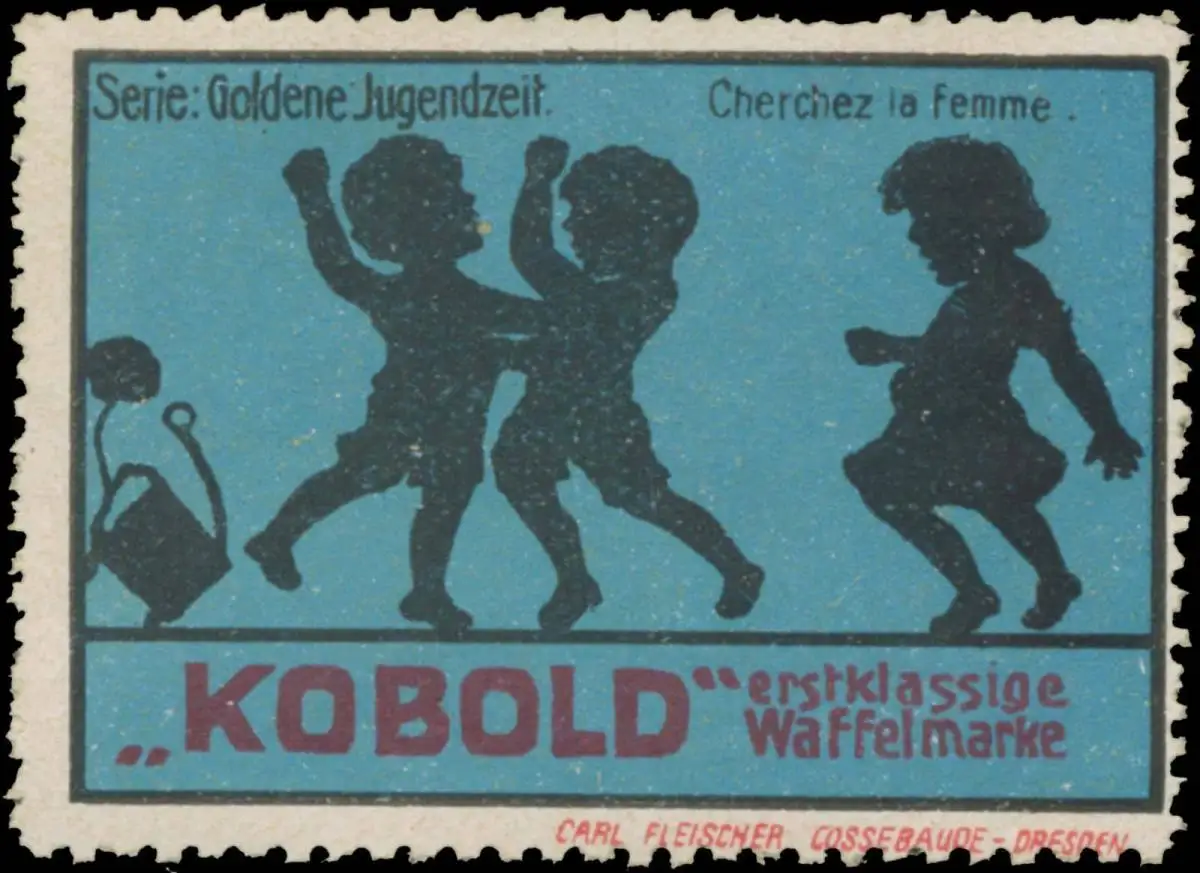 Kobold erstklassige Waffelmarke, Serie: Goldene Jugendzeit, Waffelfabrik, Essen, Leipzig, Breslau, Druck: Carl Fleischer, Cossebaude-Dresden, Größe/Zustand: 4x6 , guter Zustand, Original alte Reklamemarke die seinerzeit für die Werbung benutzt wurde