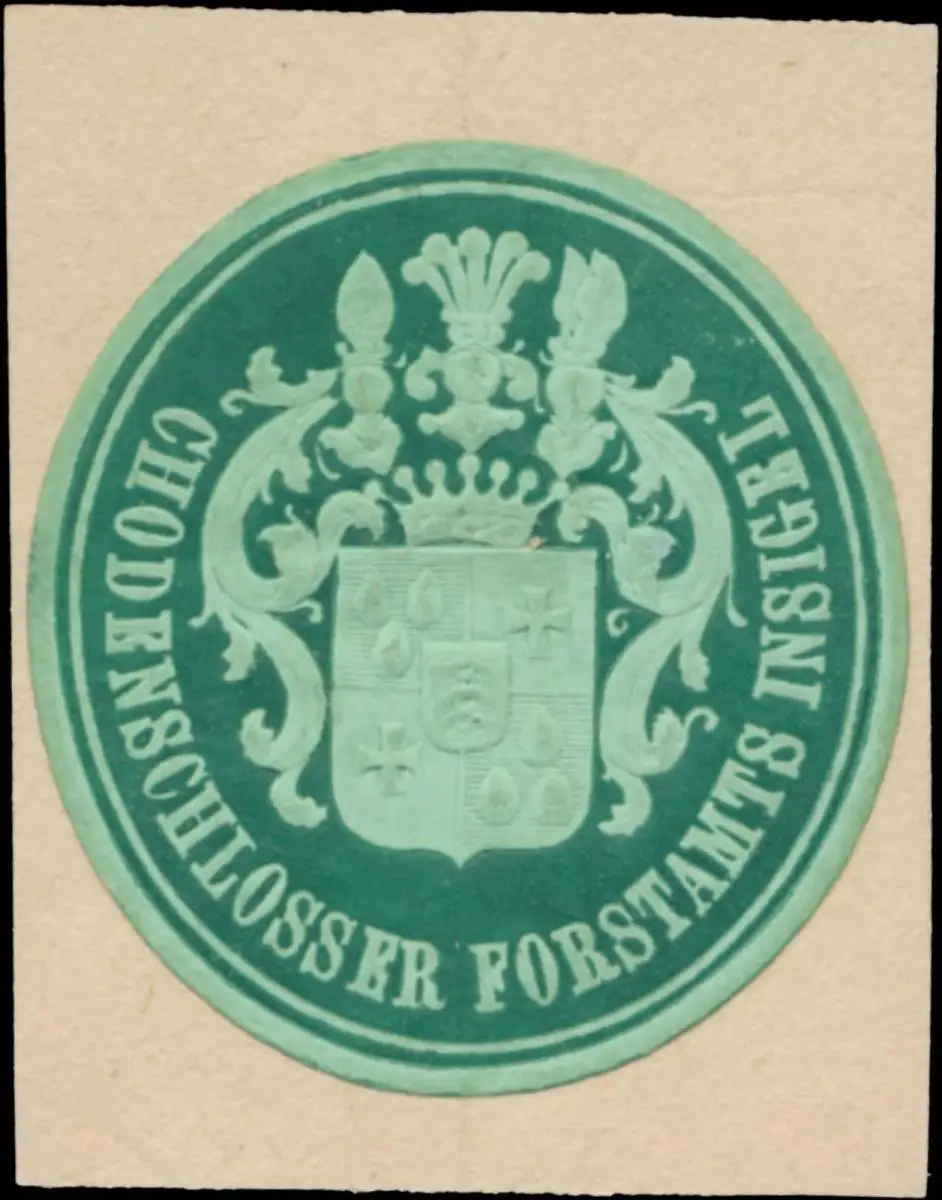 Forst, Chodenschloss, Größe/Zustand: 3x3 , guter Zustand, Original Verschluss-Siegelmarke aus Papier welche früher von Behörden, Firmen etc. zum Versiegeln der Briefe benutzt wurden