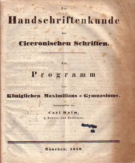 Cicero, Marcus Tullius (106 v. Chr. - 43 c. Chr.). - Halm, Carl: Zur Handschriftenkunde der Ciceronischen Schriften. Als Programm des Königlichen Maximilians-Gymnasiums herausgegeben.