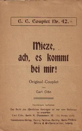 Clön, Carl: Text: 'Mieze, ach, es kommt bei mir!' Original - Couplet. (= C. C. Couplet Nr. 42).