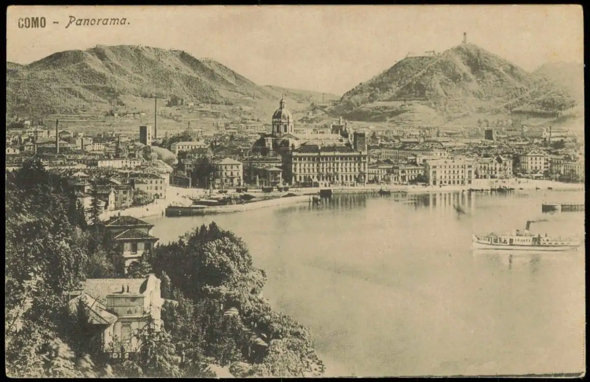 Como Panorama-Ansicht, Teilansicht Partie am See, einlaufendes Schiff 1900