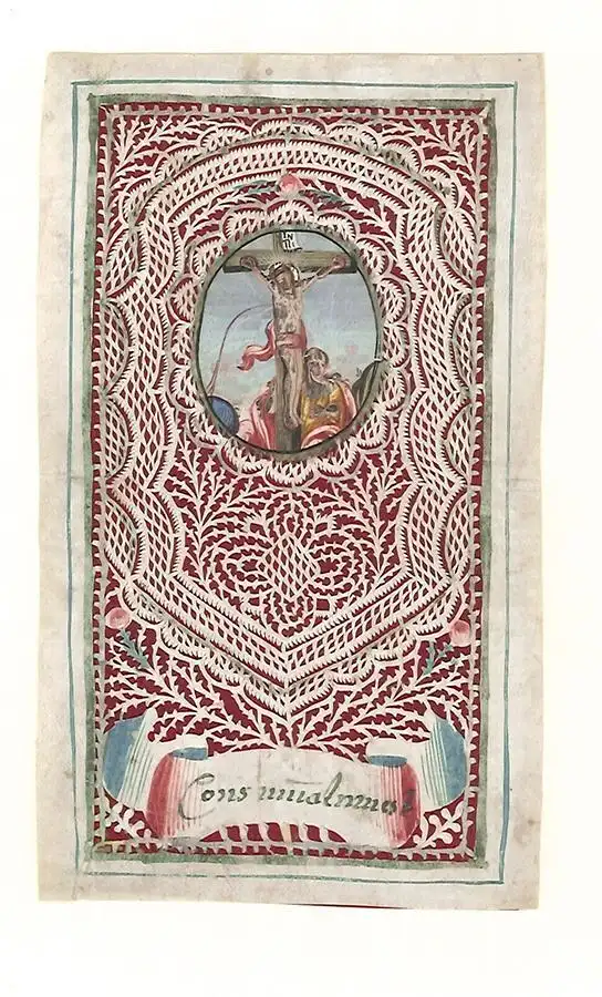 Bemerkungen: In einem Medaillon umgeben von filigraner, wohl ausgeschnittener Spitze, ist Christus am Kreuz zu sehen. Verso unleserlich in Tinte beschriftet.
